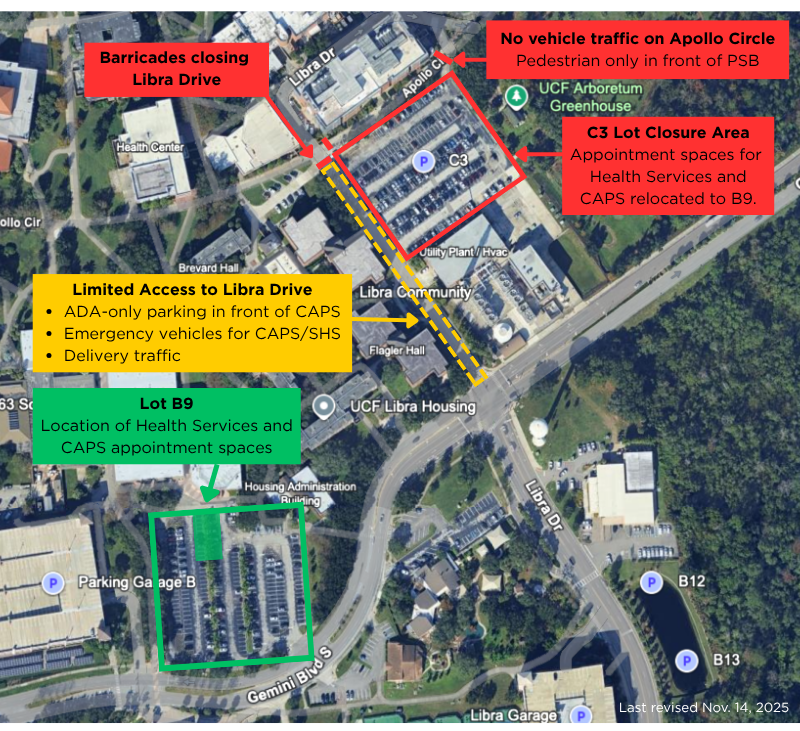 Parking spaces reserved for Student Health Services appointments will be temporarily relocated to lot B9 during construction. See the map below for reference.