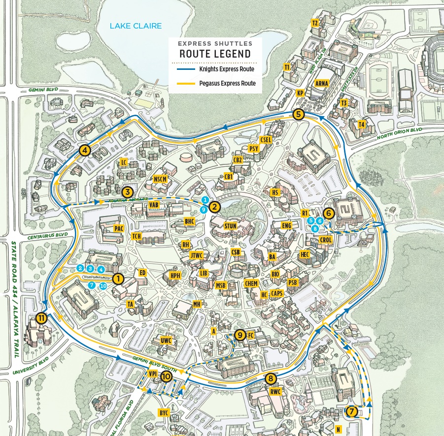 The Pegasus Express and Knights Express are the on-campus shuttles available to take students, employees and guests around campus. The Pegasus Express runs clock-wise on the Gemini loop and the Knights Express runs counter-clockwise on the same loop. There are ten designated stops that are in proximity to most academic buildings and popular locations on campus. In addition to students and employees, guests visiting the university may also utilize this complimentary bus service. All shuttles are ADA accessible and operate when classes are in session Monday – Friday.